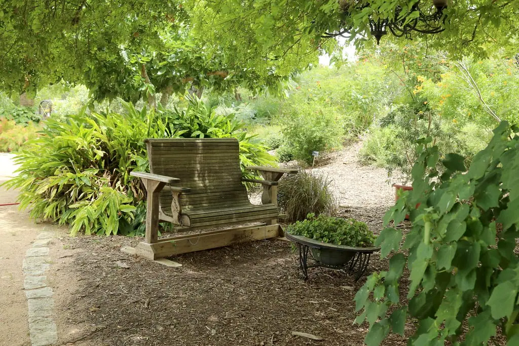 A friend of mine lives on a hilly property and built a bench at the high point overlooking her raised beds. From there, you can see the whole layout — tomatoes lined up like little soldiers, squash leaves sprawling like sunbathers, and hummingbirds zipping through the zinnias.